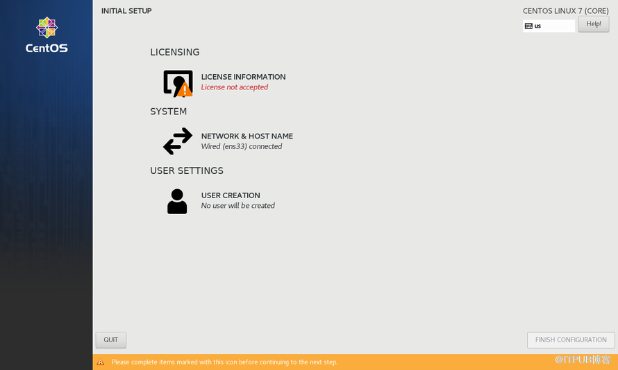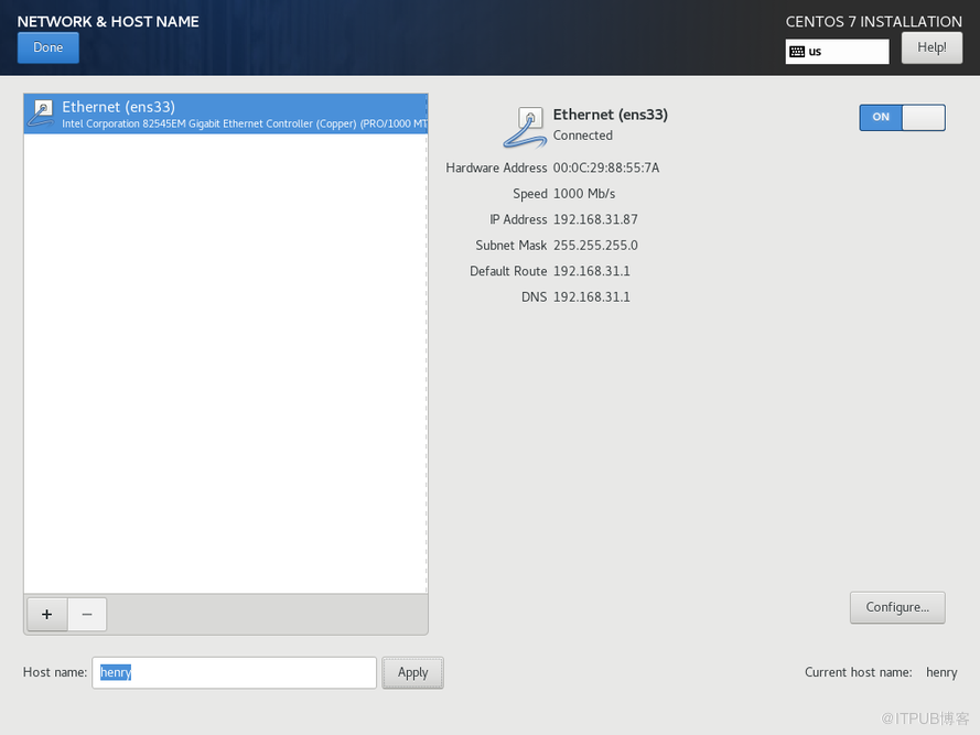 - 在 选项汇总界面 选择 Network & Host Name 设置网络及主机名