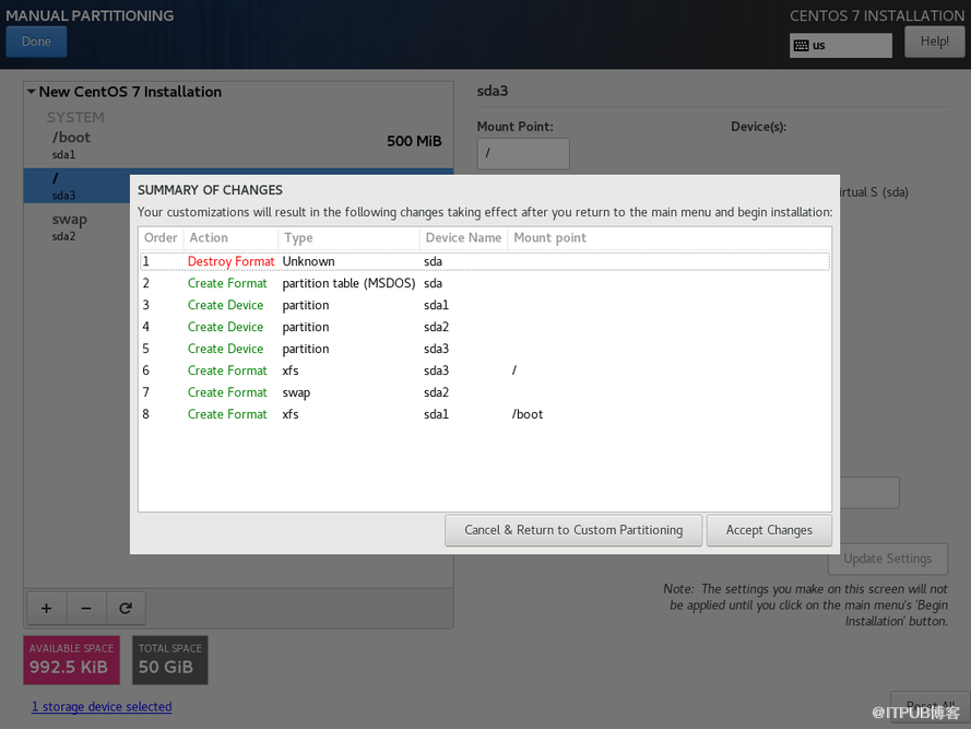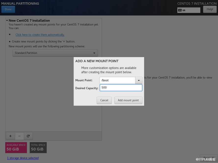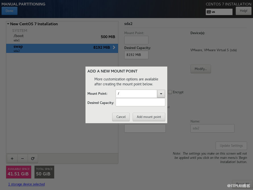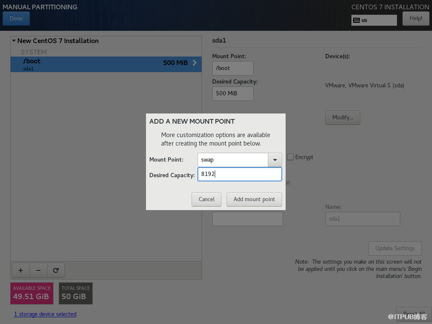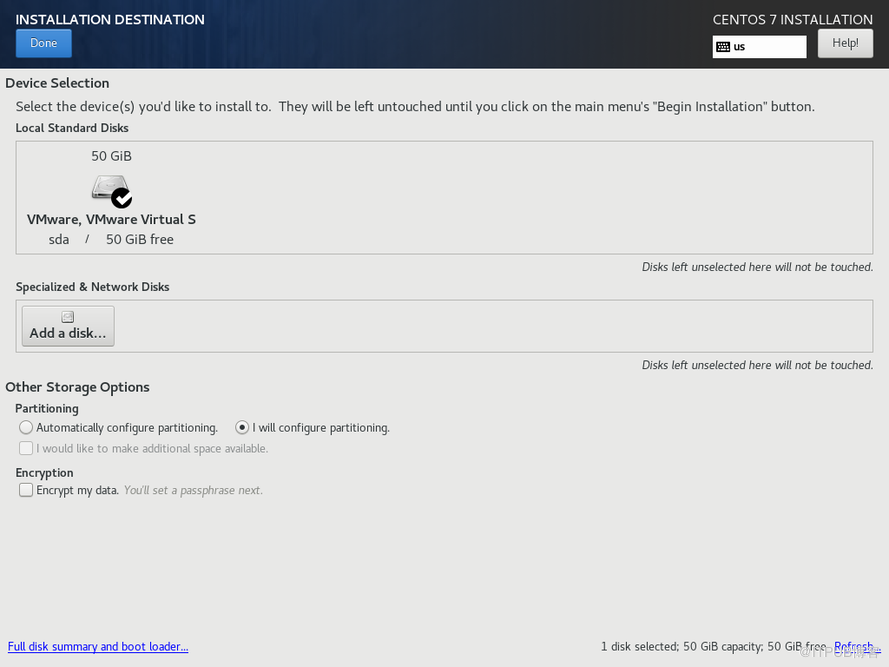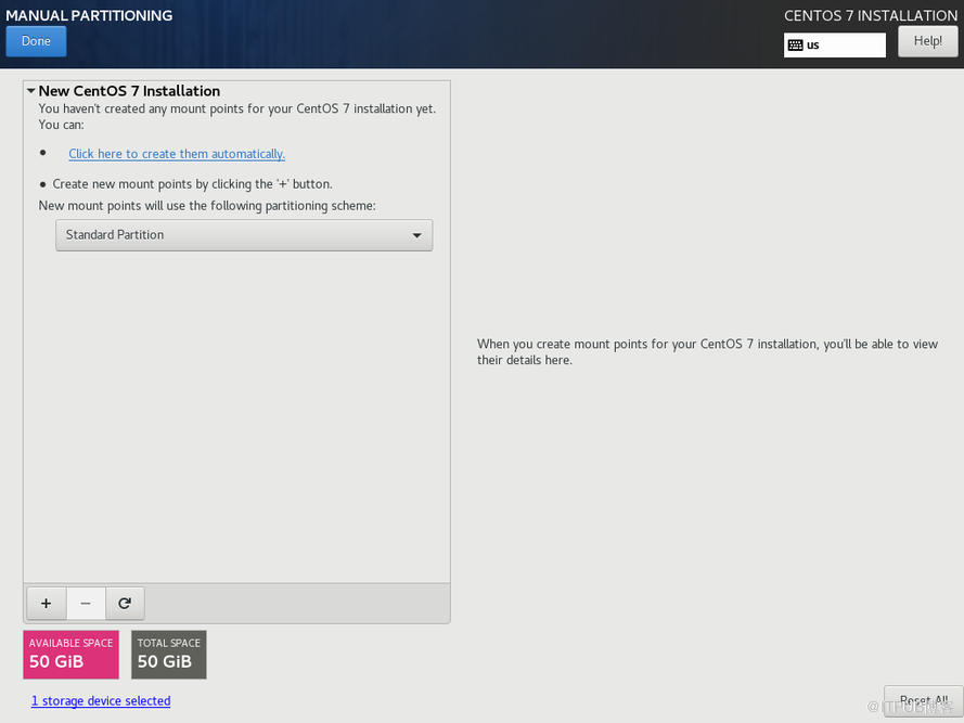 - 在 选项汇总界面 选择 Installation Destination 进行分区