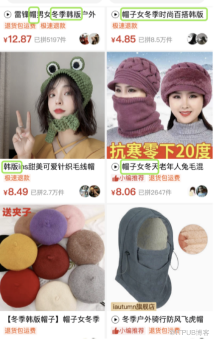 根据拼多多商品的搜索,我们可以发现搜索结果页面在排除了推广广告位置后,优先展示的是与搜索词一致性或相似性最高的商品,从“精确词匹配—>中心词匹配—>相似匹配“等,比如我们搜索”冬季韩版帽子“可以观察到搜索的商品名称都是匹配在“帽、冬季、韩版”的关键词上