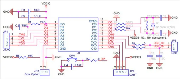 模组与外围器件(如电源、天线、复位按钮、JTAG 接口、UART 接口等)连接的应用电路图。