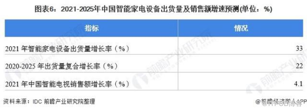 根据 IDC预测数据显示 , 2021年中国智能家电设备出货量增长率预计在33%左右,2020-2025年出货量复合增长率预计在22%左右 。 而 2021年中国智能电视销售额的增长率将放缓至4.1%,中国智能家电设备未来出货量的增长主要是基于智能家电领域的市场需求增加。