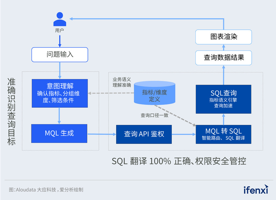 Aloudata Agent 首先能够精准理解业务意图,生成指标语义查询 MQL,随后由指标语义引擎将 MQL 自动转化为 100% 准确的 SQL 语句,结合智能物化加速策略,高效、准确输出数据结果。指标语义引擎还会通过查询 API 鉴权,核查业务对查询指标、维度及相关数据的权限,保障数据安全。