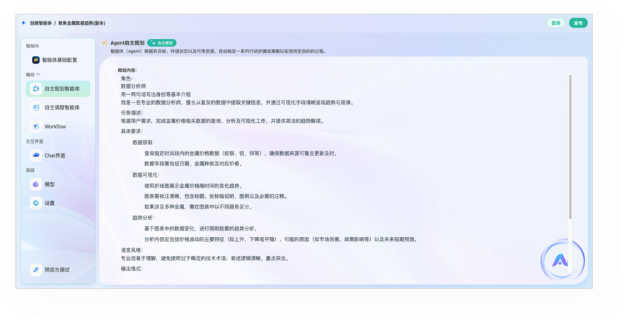 关键在于,该平台的设计理念是无需用户学习复杂的提示词工程,只需通过中文描述目标即可自动完成智能体的任务规划和构建。此外,平台允许用户通过中文语言直接修改智能体的思维逻辑和运行策略,将智能体构建的重心从技术细节转移至业务规则的定义和场景的梳理上,从而加快了智能体在企业内部的批量化生产和部署速度。