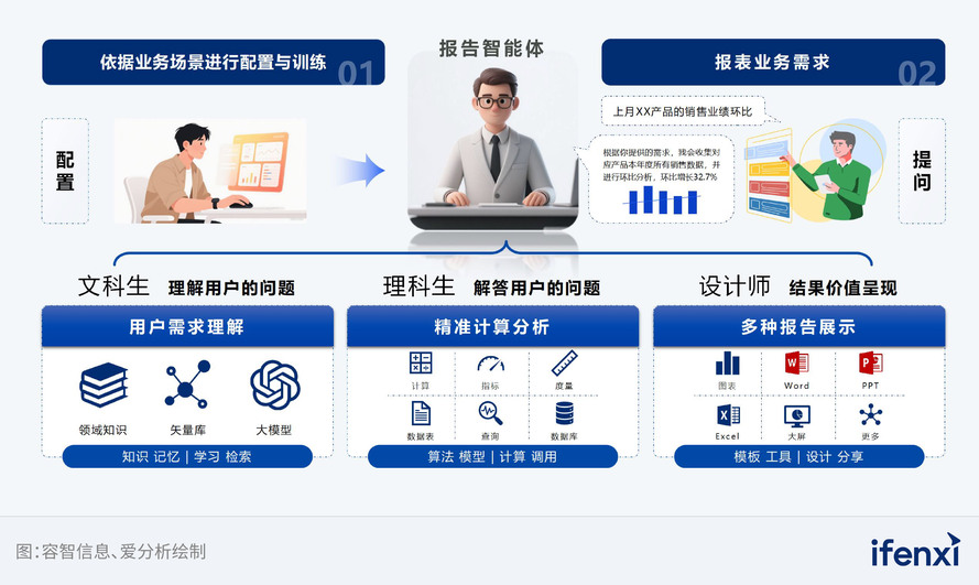 l ReportAgent旨在贯穿企业数据分析报告的全生命周期。其核心能力架构可概括为三个相互支撑的模块:业务语义理解、高精度计算分析和多格式报告生成。