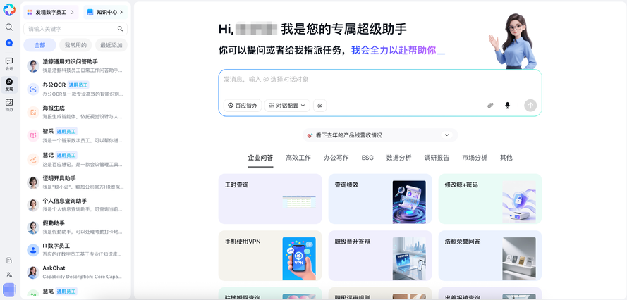 “鲸智百应”是浩鲸科技推出的一款企业AI操作系统,旨在解决AI从“外挂工具”向组织“原生能力”转变的问题。该产品架构包含“三门户、五引擎”。其中,五大引擎(知识、决策、流程、记忆、插件)构成了智能服务的核心底座,实现了从意图理解、任务分解到自动执行的闭环。特别是其独有的“Data Cloud”和“Function Cloud”,利用UI-Agent等技术,能够在不改造原有业务系统的前提下,实现对企业存量数据和功能的低成本、无侵入式调用和协同、增强智能化能力。产品支持快速构建具有岗位属性的“数字员工”,覆盖财务、人资、销售等高频场景,助力企业构建人机协同的新型组织形态。
