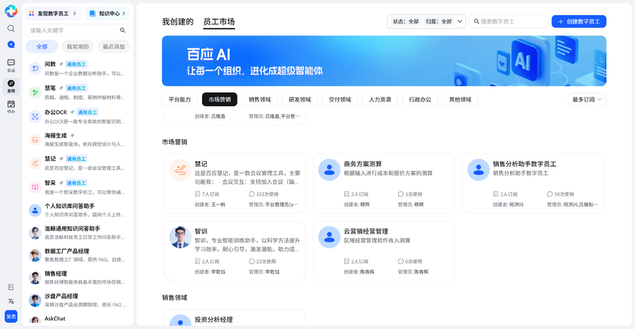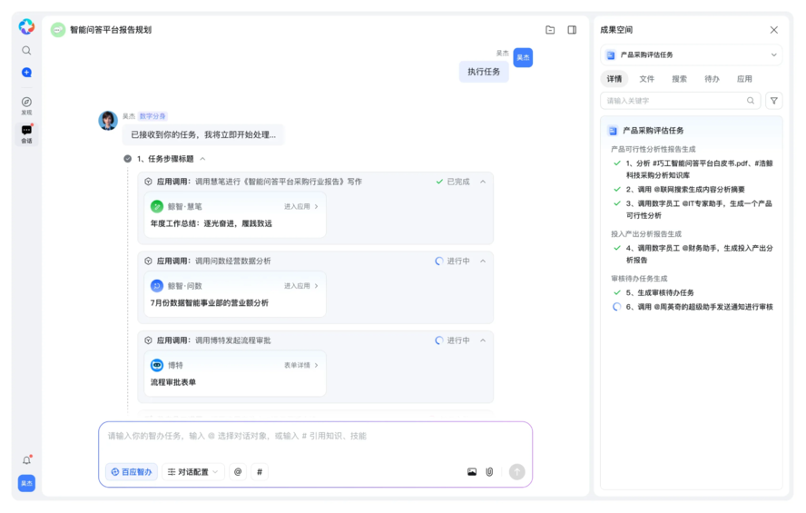 这种从底层操作系统视角出发的设计,使得企业能够对数字员工进行统一的身份授予、权限管控和全生命周期管理(创建、应用、评估、迭代),从而真正支撑起 “人+数字员工”的新型组织架构,而非堆砌零散的AI应用。
