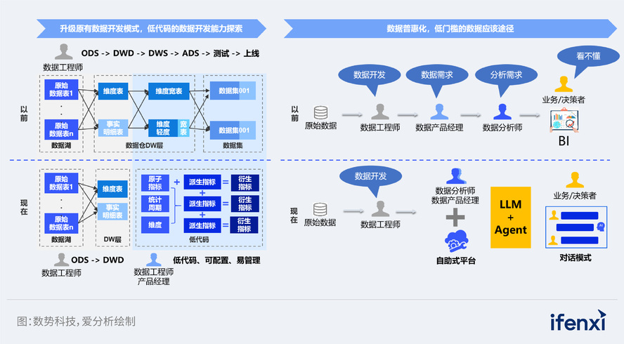 数据民主化不足: 一方面重点业务数据模型和经营指标建设仍采用科技开发模式,建设与维护成本高,也难以快速响应业务需求;另一方面,业务数据自服务依赖传统 BI工具,技术使用门槛相对较高,部分业务人员依赖BP团队提供指导,响应周期长。