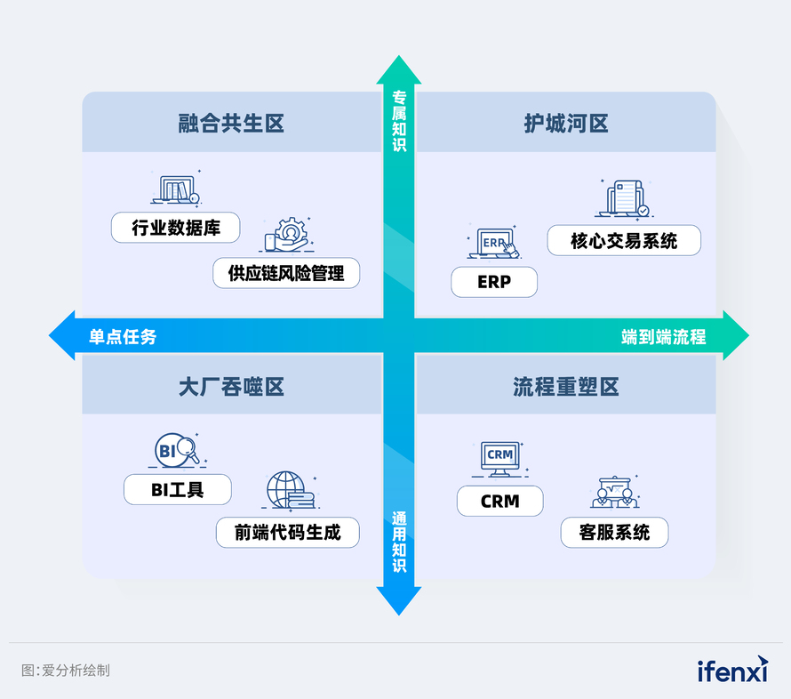 然而,当视角移向坐标轴的高处,即涉及隐性知识与业务机理的深水区时,情况则截然不同。隐性知识往往存在于行业专家的经验中,或是隐藏在业务机理之后。这些专属知识是应用厂商深厚的护城河。