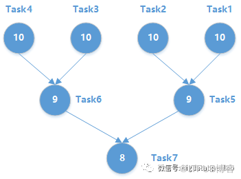 计算平台将一个复杂Job拆分为多个任务,并且按照Task之间的依赖关系生成一个依赖图(DAG),如下图所示,每个节点是一个计算任务,每个有方向的边代表依赖关系。在这个例子里,Task1-4可以同时执行,并行度为4,也就是可以同时有4个节点在执行任务。Task 5和6需要等待前序4个任务都完成后才能开始计算任务,而Task 7需要等待Task 5和6完成后才能开始计算。每个服务器处理哪些Task是由一些mapping算法来决定,如在MapReduce和Spark中,都采用了这个模型,并且都是根据数据在哪个节点上来决定对应的计算任务在哪个服务器上启动。