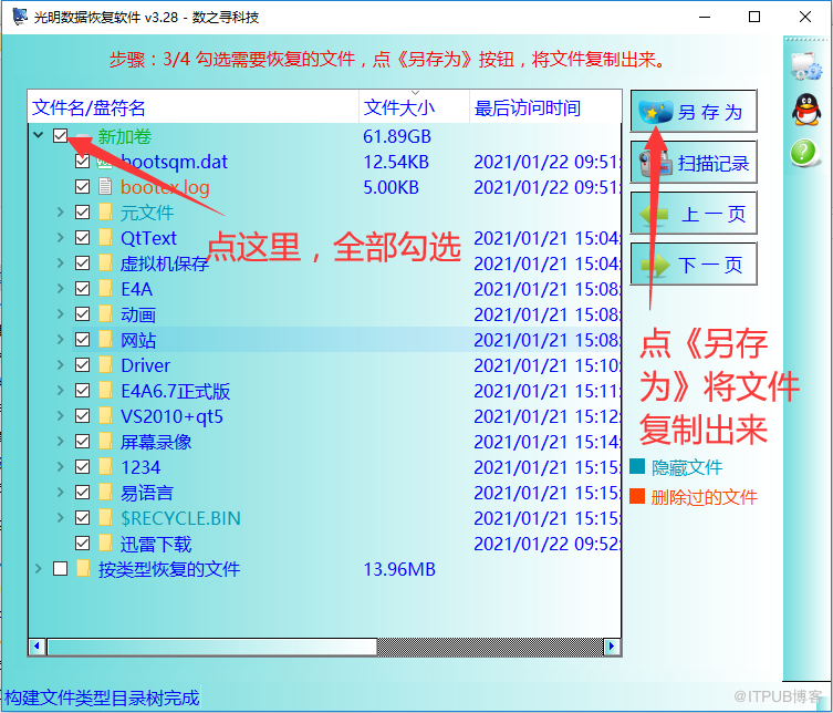 步骤6:勾选所有需要恢复的文件,接着点右上角的《另存为》按钮,将勾选的文件复制出来。