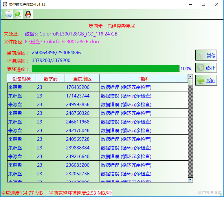步骤3:等待软件克隆完成就行,克隆如果遇到坏道软件会提示。软件会优先克隆没有坏道的区域,第一次克隆完成后,再来克隆之前有坏道的区域。