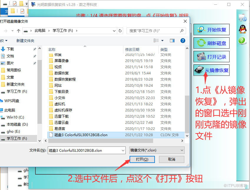 步骤4:镜像文件做好之后,打开光明数据恢复软件。在软件点《从镜像恢复》按钮,然后选中刚刚做的镜像文件,点《打开》按钮,软件就会对这个镜像文件进行扫描恢复。