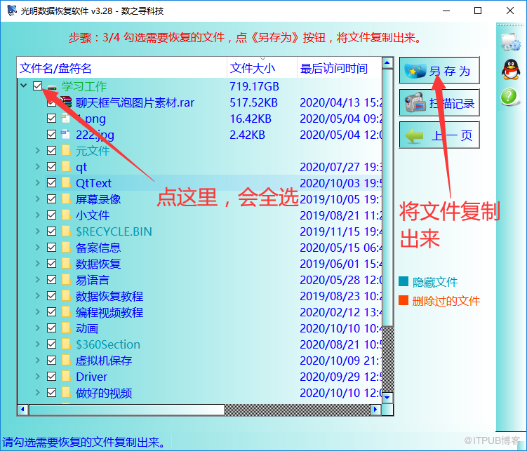 步骤3:勾选所有需要恢复的文件,接着点右上角的《另存为》按钮,将勾选的文件拷贝出来。