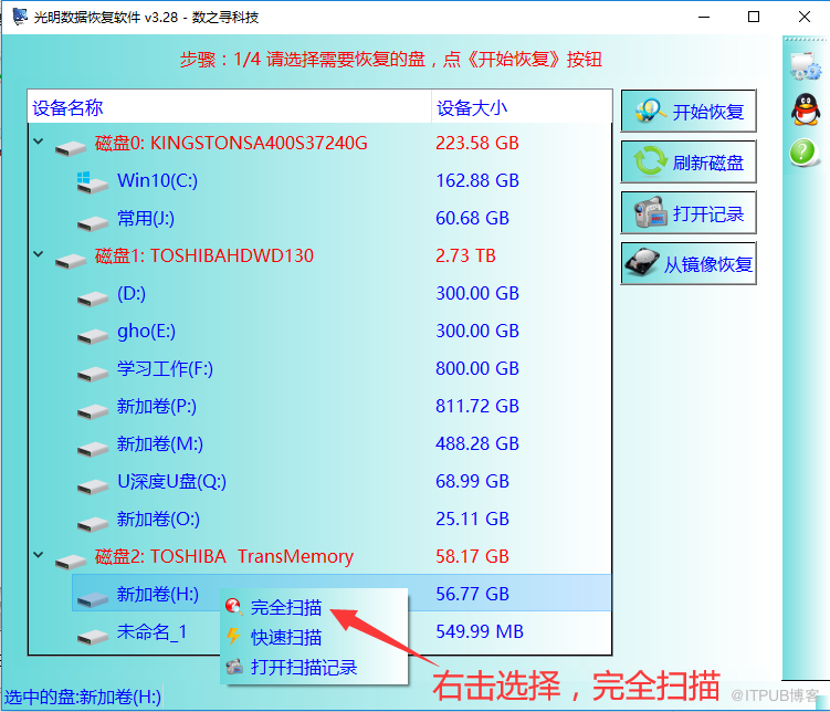 步骤1:打开软件后,在软件中右击需要恢复的盘,选择完全扫描(格式化的盘需要完全扫描才行)。