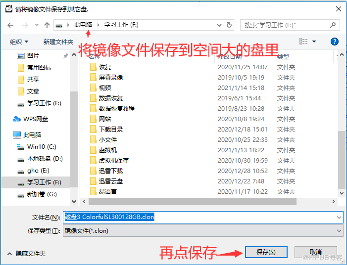 步骤2:点《到文件》按钮后,软件会弹出镜像文件保存路径,选择一个容量大的盘保存(空闲空间要大于坏道盘才行)。
