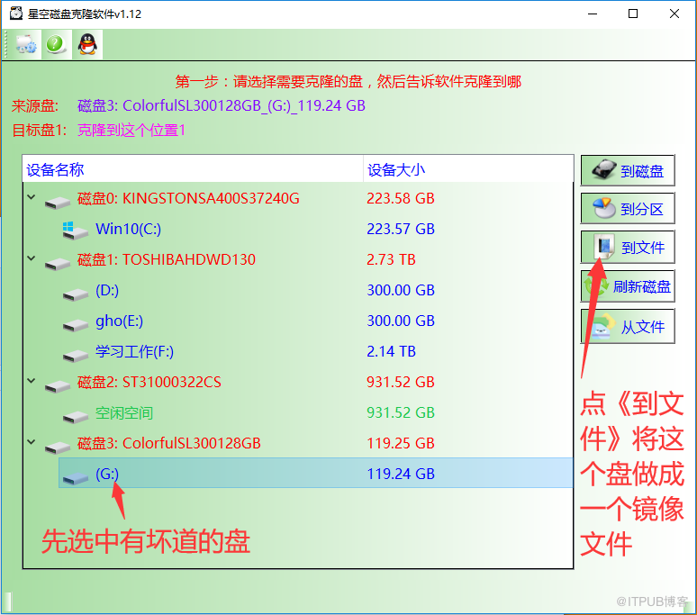 步骤1:先下载并解压星空磁盘克隆软件,软件打开后,选中需要做镜像的盘,再点《到文件》按钮,将坏道盘做成一个镜像文件。