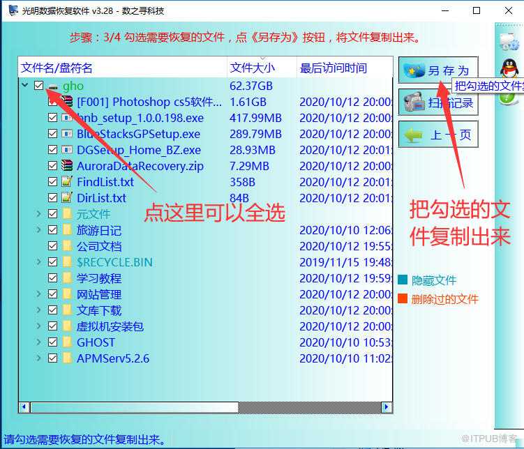 步骤3:勾上所有需要恢复的资料,接着点右上角的《另存为》按钮,将勾上的文件拷贝出来。