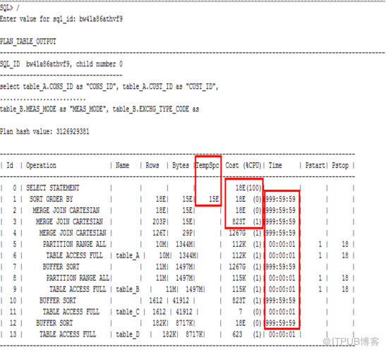 4 查看相关 SQL 的执行计划,发现进行排序耗费的临时表空间为 18E ,即为 18*1024*1024G ,这明显应该是写的 SQL 有问题,产生笛卡尔积的结果。