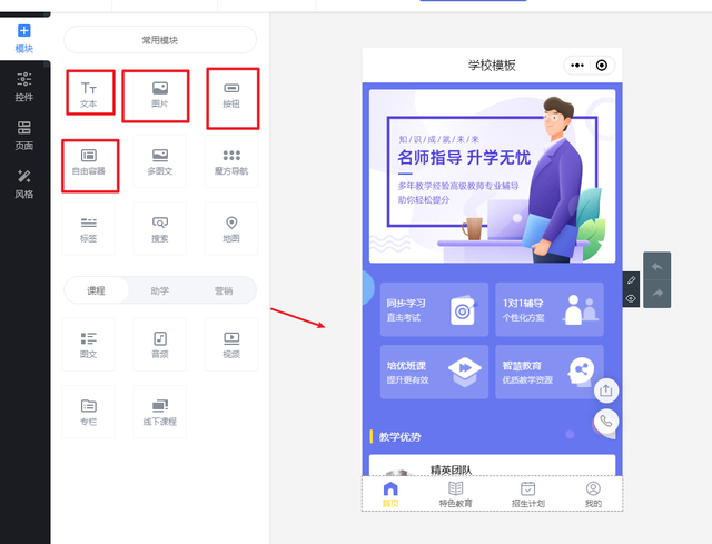在学校模板中,我们可以对模板的文本、图片、按钮、自由容器等进行更换,替换成自己的学校相关内容。