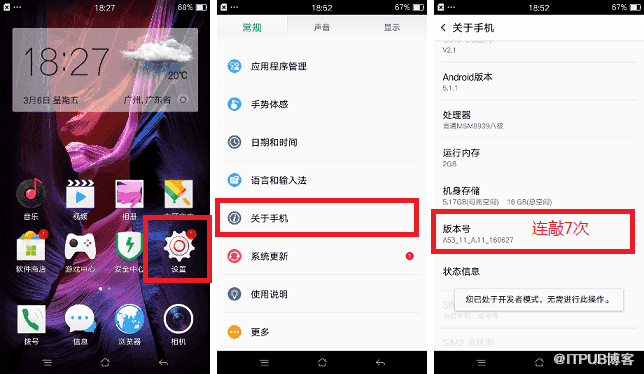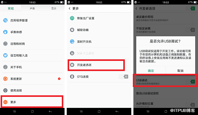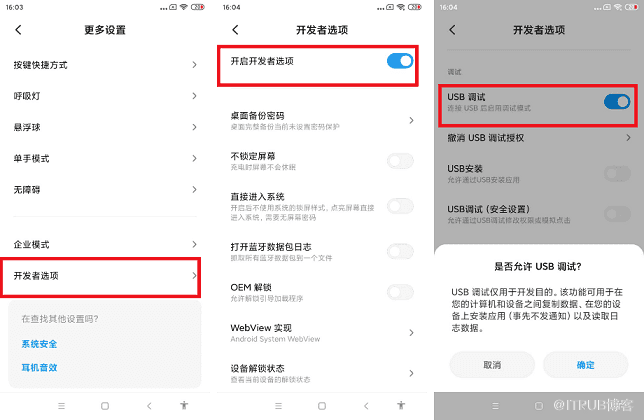 在桌面打开「设置」,点击「更多设置」,点击「关于手机」,并找到「软件版本号」之后连翘7次;返回到「更多设置」中,可以看到多了一个「开发者选项」,点击进去之后一次「开启开发者」选项和「USB调试」模式。