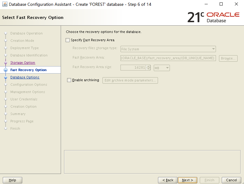 6、指定快速恢复区存储类型、位置和大小,是否启用重做日志归档,默认不开闪回和归档