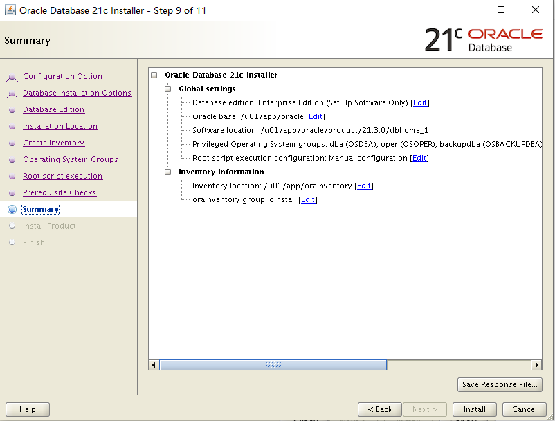 [oracle@forest ~]$ ll -h total 20K -rw-r--r--. 1 oracle oinstall 19K Oct 18 00:10 runInstaller.rsp [oracle@forest ~]$ egrep -v '^#|^$' runInstaller.rsp oracle.install.responseFileVersion=/oracle/install/rspfmt_dbinstall_response_schema_v21.0.0 oracle.install.option=INSTALL_DB_SWONLY UNIX_GROUP_NAME=oinstall INVENTORY_LOCATION=/u01/app/oraInventory ORACLE_BASE=/u01/app/oracle oracle.install.db.InstallEdition=EE oracle.install.db.OSDBA_GROUP=dba oracle.install.db.OSOPER_GROUP=oper oracle.install.db.OSBACKUPDBA_GROUP=backupdba oracle.install.db.OSDGDBA_GROUP=dgdba oracle.install.db.OSKMDBA_GROUP=kmdba oracle.install.db.OSRACDBA_GROUP=racdba oracle.install.db.rootconfig.executeRootScript=false oracle.install.db.rootconfig.configMethod= oracle.install.db.rootconfig.sudoPath= oracle.install.db.rootconfig.sudoUserName= oracle.install.db.CLUSTER_NODES= oracle.install.db.config.starterdb.type=GENERAL_PURPOSE oracle.install.db.config.starterdb.globalDBName= oracle.install.db.config.starterdb.SID= oracle.install.db.config.PDBName= oracle.install.db.config.starterdb.characterSet= oracle.install.db.config.starterdb.memoryOption=false oracle.install.db.config.starterdb.memoryLimit= oracle.install.db.config.starterdb.password.ALL= oracle.install.db.config.starterdb.password.SYS= oracle.install.db.config.starterdb.password.SYSTEM= oracle.install.db.config.starterdb.password.DBSNMP= oracle.install.db.config.starterdb.password.PDBADMIN= oracle.install.db.config.starterdb.managementOption=DEFAULT oracle.install.db.config.starterdb.omsHost= oracle.install.db.config.starterdb.omsPort=0 oracle.install.db.config.starterdb.emAdminUser= oracle.install.db.config.starterdb.emAdminPassword= oracle.install.db.config.starterdb.enableRecovery=false oracle.install.db.config.starterdb.storageType= oracle.install.db.config.starterdb.fileSystemStorage.dataLocation= oracle.install.db.config.starterdb.fileSystemStorage.recoveryLocation= oracle.install.db.config.asm.diskGroup= oracle.install.db.config.asm.ASMSNMPPassword=