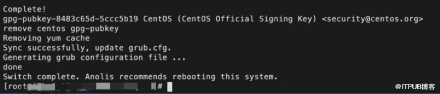 迁移完成后,系统会提示如下信息,表示迁移成功,重启即可进入龙蜥操作系统(Anolis OS)。
