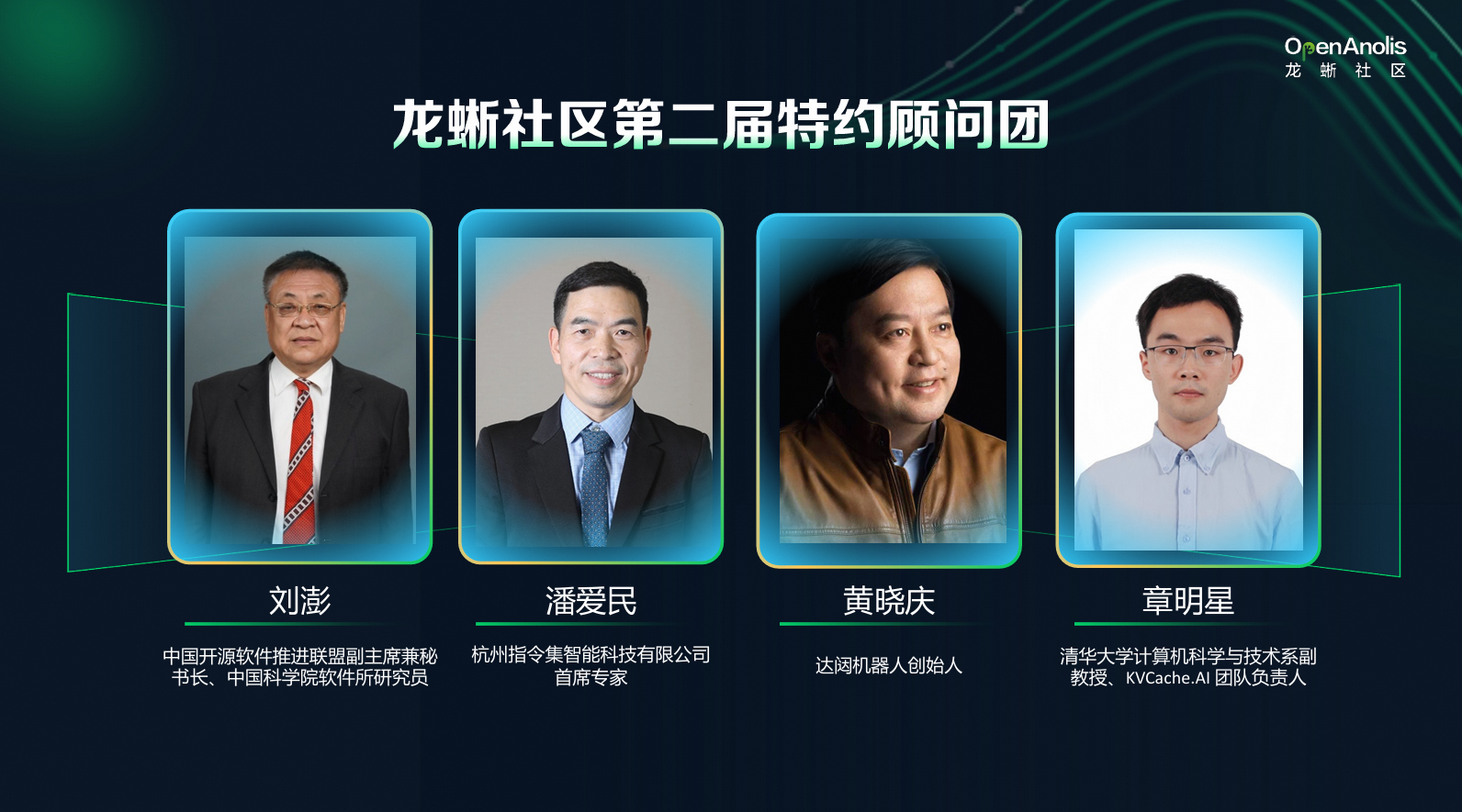 第二届特约顾问团也同样云集了多位行业领军人物,分别由中国开源软件推进联盟副主 席兼秘书长、中国科学院软件所研究员刘澎,杭州指令集智能科技有限公司首席专家潘爱民,达闼机器人创始人黄晓庆,清华大学计算机科学与技术系副教授、KVCache.AI 团队负责人章明星四位专家担任。