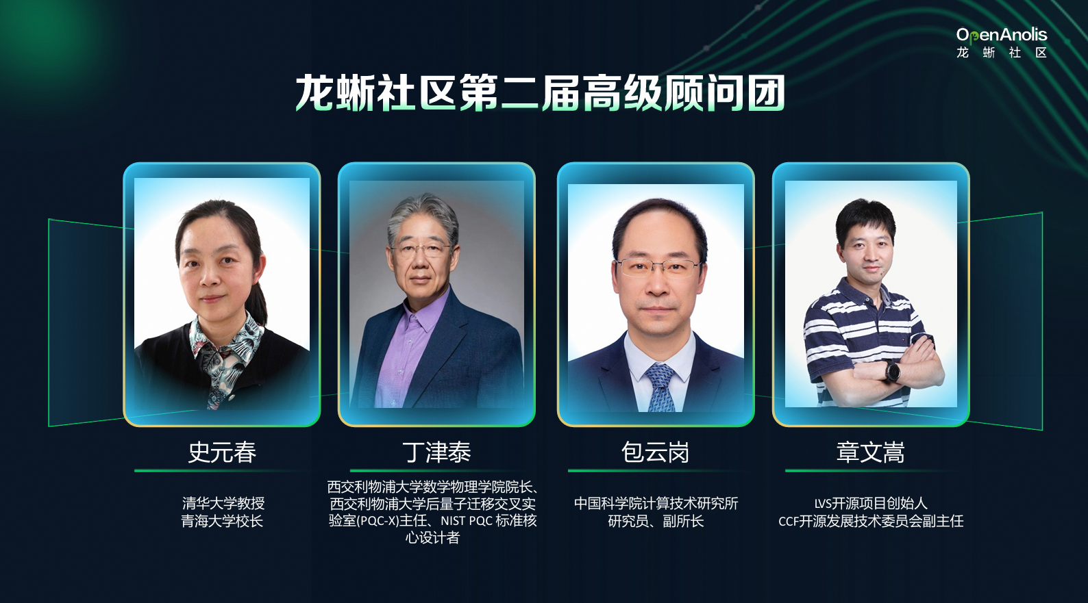 在陈纯院士等专家的指导下,龙蜥社区持续繁荣发展,同时,他也把期待交给了下一届顾问团。其中,第二届高级顾问团汇聚了多位成果卓著的专家学者,他们分别是:清华大学教授、青海大学校长史元春,西交利物浦大学数学物理学院院长、西交利物浦大学后量子迁移交叉实验室(PQC-X)主任、NIST PQC 标准核心设计者丁津泰,中国科学院计算技术研究所研究员、副所长包云岗,LVS开源项目创始人、CCF开源发展技术委员会副主任章文嵩博士。