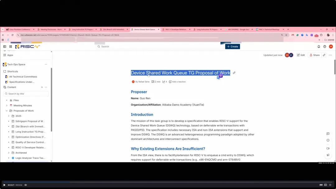 郭任在文档讲解中首先明确 TG 使命:为 RISC-V 构建支持 Device Shared Work Queue(设备共享工作队列)的规范体系,使其能够基于“可延迟写(deferable/deliverable write)事务”与 PASID/PID 等机制,实现面向异构设备的高密度 I/O 虚拟化与可迁移能力。