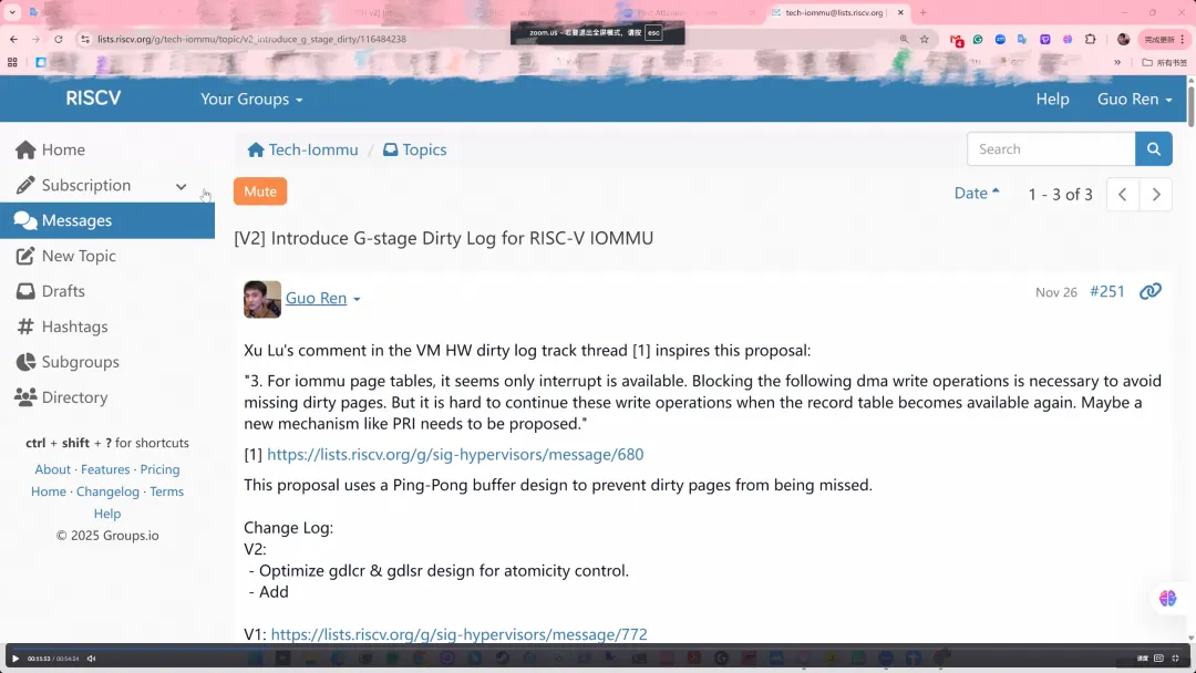 近期,RISC-V 基金会 Data Center SIG 月度会议于线上召开,本次会议邀请阿里巴巴达摩院郭任进行分享。会议由阿里巴巴宋卓主持。会议按惯例完成社区协作、反垄断与出口管制等合规提示后,进入本次核心议题:阿里巴巴达摩院郭任分享一项面向 RISC-V IOMMU 的 G-Stage Dirty Log 硬件加速机制提案,并与 RISC-V International 的 Rafael Sene 就后续以任务组(TG)方式推进达成初步共识。