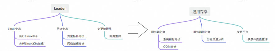 这样通过智能体间的对话解决问题也并不是我们一开始就想到的,一开始我们是打算使用效仿日常的工作协作拓扑(该思路在第一篇中有提到):用一个Leader带领多个专家分析解决问题,由Leader来做最终汇总---但最终每次对话token花了一大堆,效果并不理想。这里面最关键的问题就是多加了一层专家抽象之后,每次分析都是专家在用工具分析给你结论,多花token耗时长不说,分析参数有时候专家还会搞错。同时,一般专家角色的划分就是Linux专家、网络专家这类,但从上面的例子我们可以看到,这样的角色划分来解决问题也会非常别扭,一个问题可能需要Linux专家和网络专家之间讨论半天才能有所进展,而他们的结论还要由Leader去汇总,想想就复杂。