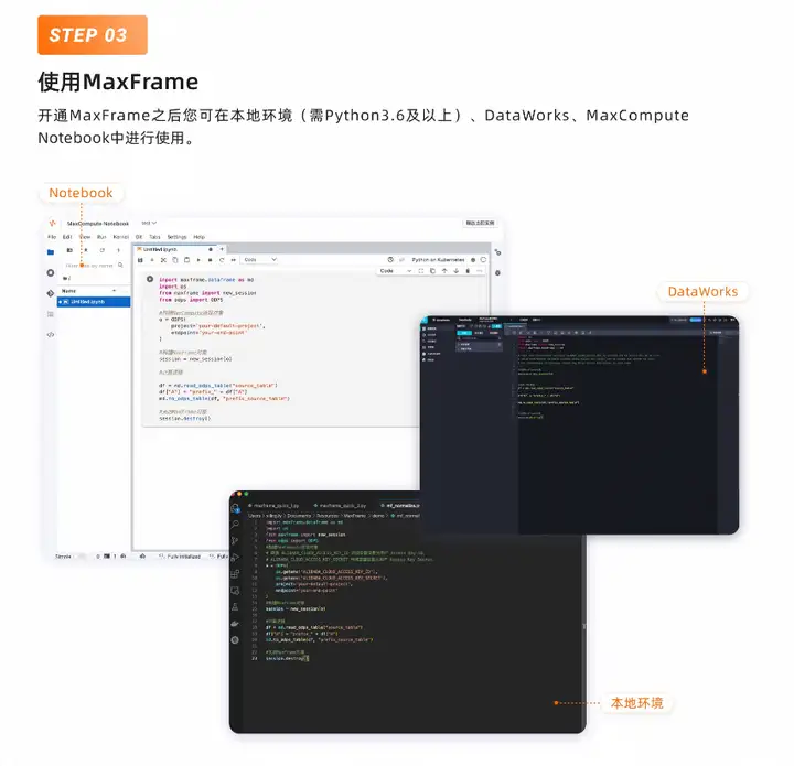 开通 MaxFrame 之后您可在本地环境(需 Python3.6及以上)、DataWorks、MaxCompute Notebook 中进行使用。