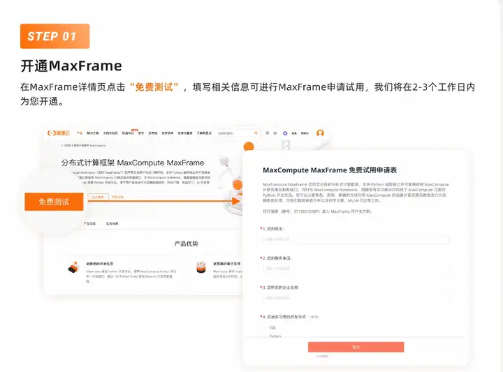 在 MaxFrame 详情页点击"免费测试",填写相关信息即可申请 MaxFrame 试 用,我们将在2-3个工作日内为您开通。