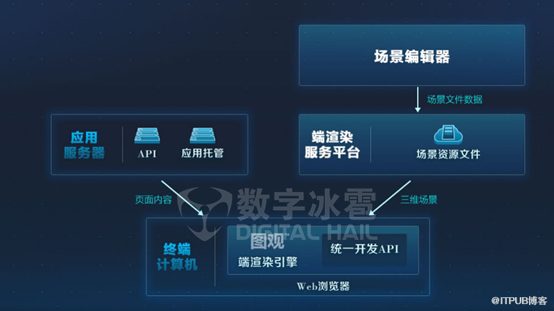 图观 端渲染开发架构,是基于 HTML5 和 WebGL 技术,整合推出的数字孪生端渲染技术支撑体系,涵盖端渲染场景编辑器、端渲染 场景服务、端渲染二次开发等技术产品,覆盖数字孪生应用开发的全生命周期,提供简便、快捷、强大的数字孪生应用运行和开发平台。