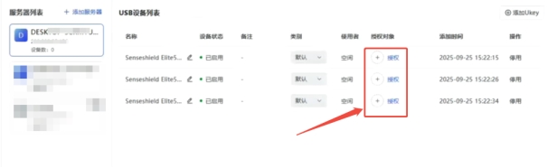 选择刚刚添加的USB服务器,点击“将Ukey添加到设备列表中”按钮,选择深思加密锁。将锁添加到控制台后,再将它们授权给具体成员。