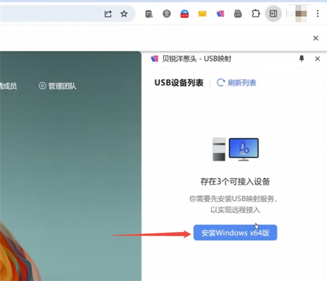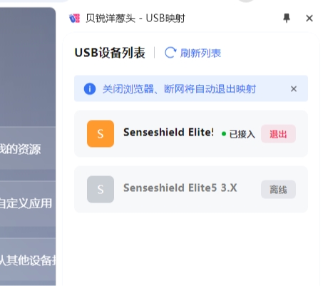 成员登录洋葱头后,在右上角的插件管理器中找到“USB映射”插件,点击后选择安装一个本地的驱动程序,安装成功后刷新插件,即可查看被授权的加密锁。选择具体的锁,点击“接入”即可。插件显示“已接入”表示已成功远程映射接入。