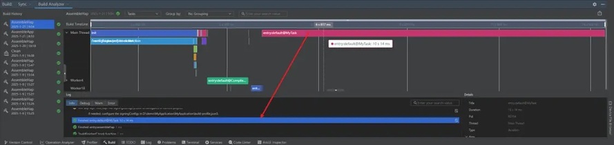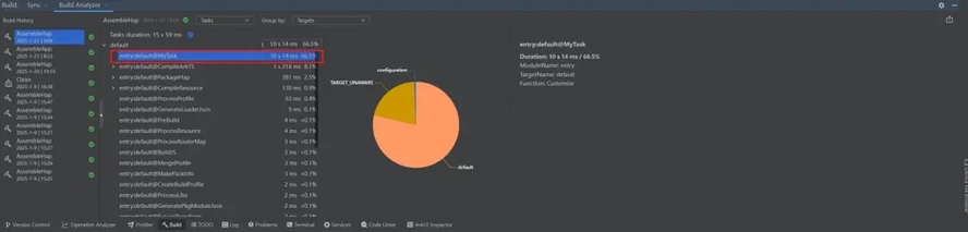 情况,并与构建日志联动,帮助开发者更直观地跟踪构建流程,快速发现性能问题。可以看出其中最耗时的任务是MyTask。