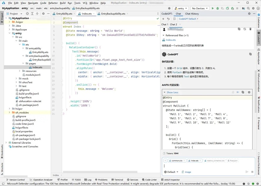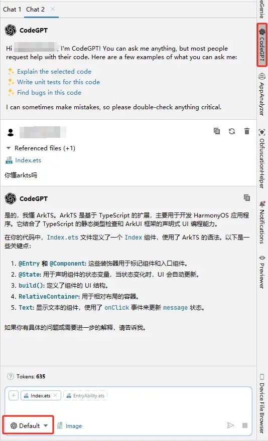 2. 辅助问答:与DeepSeek交流有关当前工程代码的问题,提供鸿蒙相关ArkTS编程参考和示例