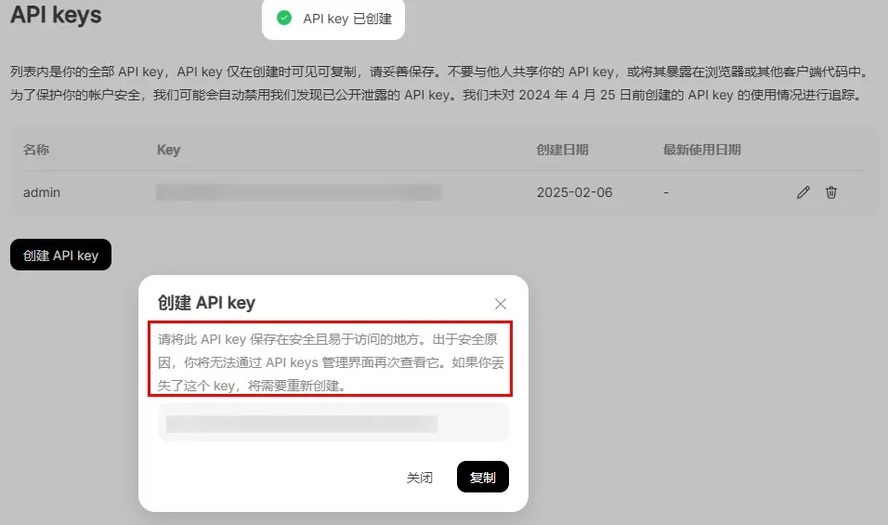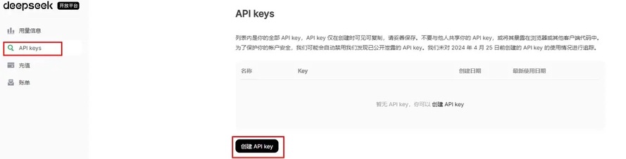 2. 创建应用:在DeepSeek控制台中创建API Key,并及时保存,出于安全访问策略,你将无法通过 API keys 管理界面再