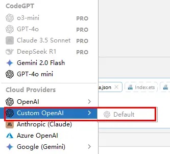 1. 选择模型:点击左侧边栏的CodeGPT,打开对话框,选择步骤4中我们在Custom: OpenAI中自定义的模型,也就是