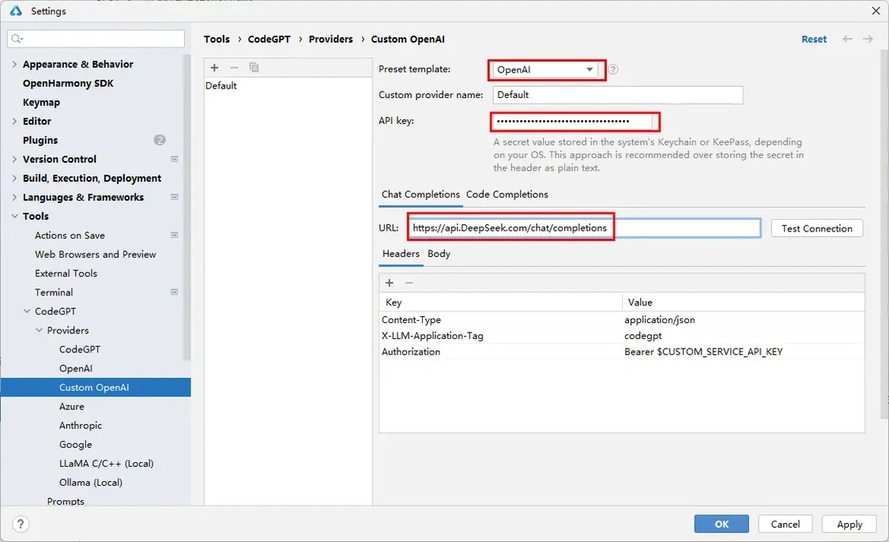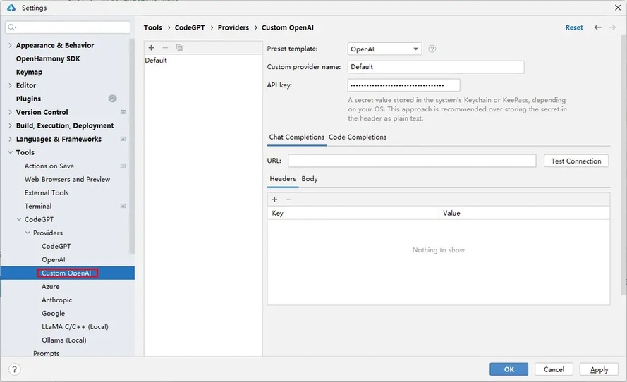 1. 打开插件配置界面:安装成功CodeGPT后,在DevEco Studio的Settings中选择Tools > CodeGPT > Providers >