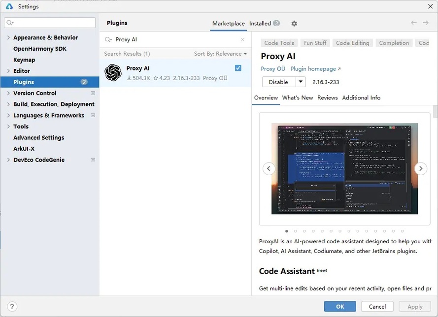 在插件市场中搜索Proxy AI或CodeGPT插件,如图所示,搜索结果为版本为2.16.3-233,执行安装。