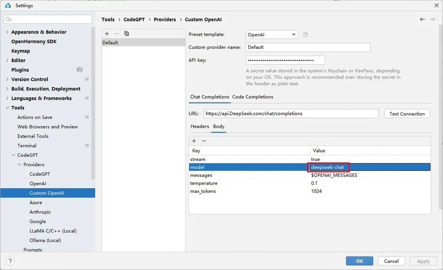 DeepSeek API 使用与 OpenAI 兼容的 API 格式,所以这里template选择OpenAI;