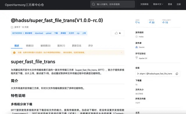 https://ohpm.openharmony.cn/#/cn/detail/@hadss%2Fsuper_fast_file_trans