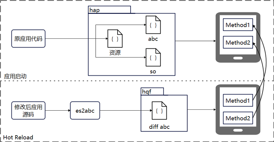 Hot Reload的原理从启动运行开始,DevEco Studio会在应用编译构建时生成增量所需的map文件,记录全 量编译的相关信息,基于这个map文件,针对后续的修改,IDE能够识别修改的文件,调用方舟编译器只编译修改的文件,