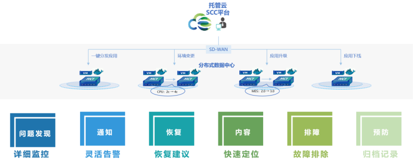 托管云SCC管理中心统一运维、远程升级乃至应用推送,副中心无需专业IT人员,采用自动化的手段,降低总部人员对大量边缘节点的运维的难度。分支节点开箱即用,新业务上线时间缩短70%,日常运维效率提升50%以上。