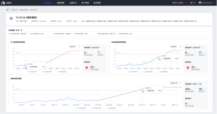 “资源预测”功能在增加用户对计算、存储资源未来风险感知能力的同时,提供了明确的资源配置建议,降低因资源不足导致的故障发生频率,提前规避因业务不足导致的业务中断或资源过剩造成成本上升的问题。