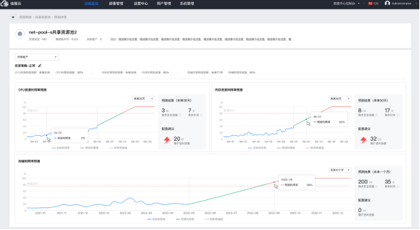 CPU、内存、存储预测中,可以看到历史数据和未来趋势,以及剩余安全容量、预计多少天后将超过安全容量阈值、以及建议扩容容量。