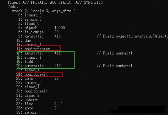 如果有多条线程执行这段number++代码,当前number为0,线程1先执行到iconst_1指令,即将执行iadd操作,而线程2执行到getstatic指令,这个时候number值还没有改变,所以线程2获取到的静态字段是0,线程1执行完iadd操作,number变为1,线程2执行完iadd操作,number还是1。这个时候就发现问题了,做了两次number++操作,但是number只增加了1。